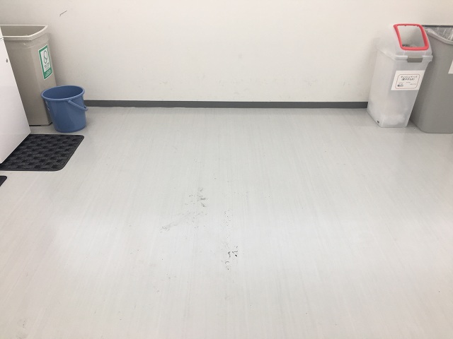 以前の清掃業者が塗布したワックスが黒ずんで汚れています。